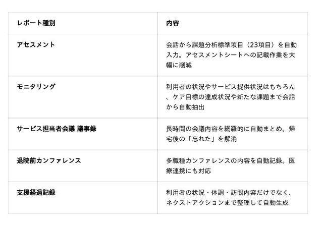 テスト導入事業所からは「サービス担当者会議は長く、オフィスに戻ると話した内容を忘れてしまうが、網羅性があって助かる」(居宅介護支援センターひだまり様)など、ケアマネジャーが日常的に抱える書類業務の負担を大幅に軽減できると好評を得ています。