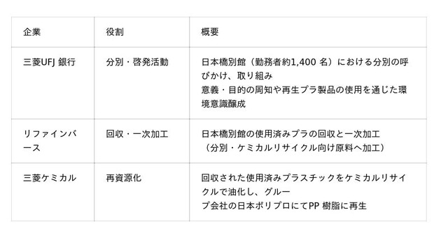 株式会社三菱UFJ 銀行(取締役頭取執行役員 半沢 淳一、以下「三菱UFJ 銀行」)、三菱ケミカル株式会社(代表取締役社長 筑本 学、以下「三菱ケミカル」)、株式会社リファインバースグループ(代表取締役社長 越智晶、以下「リファインバース」)、の3 社は、オフィスから排出される使用済みプラスチックの再利用促進に向けた取り組みとして、三菱UFJ 銀行日本橋別館で発生する使用済みプラスチックの一部(クリアファイル、包装材、緩衝材等)を回収・再資源化し、行員向けの社員証カードホルダーとして再活用する循環スキームの構築に関する覚書を締結しました。本取り組みを通じ、プラスチック原料の国内資源循環を進めることで、環境負荷と資源調達リスクの低減および新たな事業機会創出をめざします。