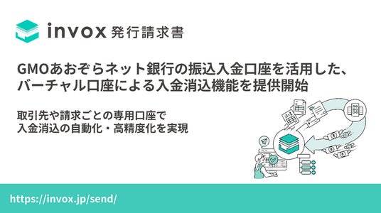 株式会社invox(東京都新宿区、代表取締役:横井 朗、以下「invox」)が開発・運営するクラウド型請求書発行システム「invox発行請求書」において、GMOあおぞらネット銀行株式会社(東京都渋谷区、代表取締役会長:金子 岳人、代表取締役社長:水町 哲、以下「GMOあおぞらネット銀行」)が提供する振込入金口座(以下「バーチャル口座」)を活用した、入金消込機能の提供を開始しました。