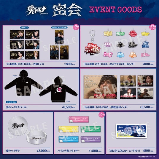 このたび、会場限定で販売するイベントオリジナルグッズのラインナップを公開いたしました。番組モチーフのパーカーや灰皿、ライターのほか、看板企画「山本裕典、ホストになる。」からは、山本裕典や軍神(心湊一希)など人気ホストらの顔写真入り“名刺トレカ”(全9種ランダム)や、企画から生まれた「エロがんなって」を始めとする名言をモチーフにした“名言アクリルキーホルダー”(全13種ランダム)、山本裕典による喫煙所での数々の"名言"を集めた“喫煙所カレンダー”、ミントタブレットが登場。イベント開催当日に会場限定で販売いたします。なお、イベントチケットをお持ちでない方会場にて購入いただけます。