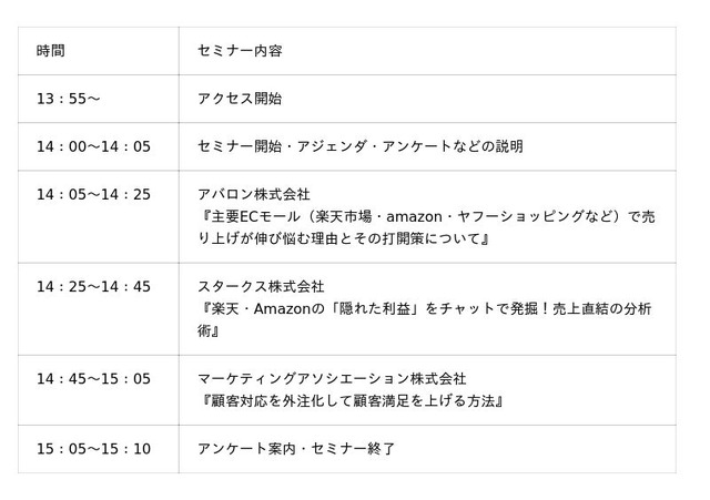 そんな状態から脱却し、「なんとなく改善」から卒業し、数字で考え、仕組みで売上を伸ばすEC運営を目指したい方に向けたセミナーとなっております。