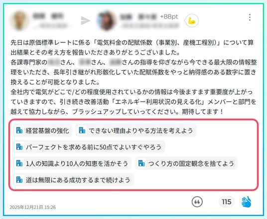 ▲赤枠箇所が「ラベル機能」。会社独自の行動基準などを設定でき、投稿の際にその内容に合致した項目を投稿者が選択して付与できる。