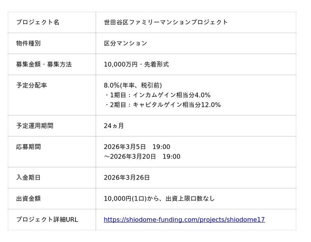 汐留プロパティ株式会社(代表取締役社長:大原龍/本社:東京都港区)は、不動産投資クラウドファンディング「汐留funding」において、第17号プロジェクトとなる「世田谷区ファミリーマンションプロジェクト」(以下、「本プロジェクト」)の情報を公開いたしました。