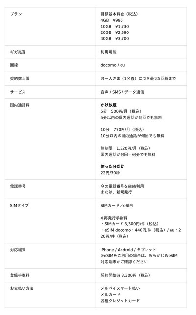 ■「メルカリモバイル」詳細(2026年2月26日時点)