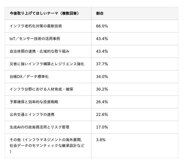 サミット終了後に実施した来場者アンケートでは、今後の地方自治体インフラAXサミットで取り上げてほしいテーマとして「インフラ老朽化対策の最新技術」が53.8%と最多の支持を集めました。次いで「自治体間の連携・広域的な取り組み」(40.4%)、「IoT/センサー技術の活用事例」(34.6%)、「災害に強いインフラ構築とレジリエンス強化」(32.7%)、「台帳DX/データ標準化」(30.8%)が続きました。技術革新そのものへの関心に加え、広域連携やデータ標準化といった運用・制度設計に関わるテーマへの支持も高く、技術紹介にとどまらない実装フェーズを見据えた議論への期待が数字に表れました。