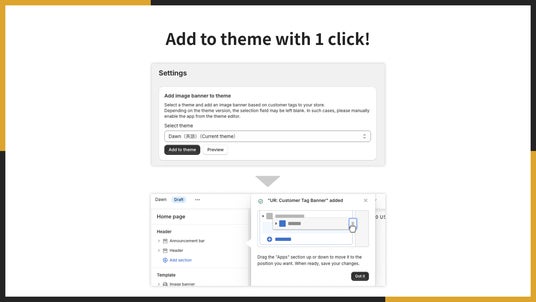 UR: Customer Tag Banner は、顧客タグを条件に表示内容を切り替えられる画像バナーを、ストア内のあらゆるページに設置できるノーコードアプリです。