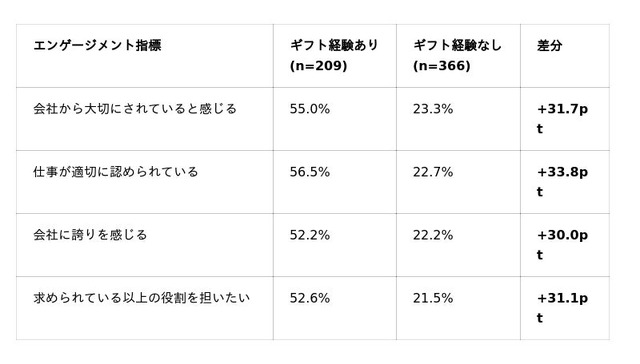 従業員向けギフト代行プラットフォームの開発・運営を行う株式会社マタビテクノロジーズ(本社:東京都港区、代表取締役:植野 力)は、会社員575名を対象とした「職場ギフトと従業員エンゲージメントに関する調査」を実施いたしました。その結果、職場でギフトを受け取った経験のある従業員は、経験のない従業員と比較して、エンゲージメントに関連する4つの指標において約2倍(30ポイント以上)高いスコアを示しました。
