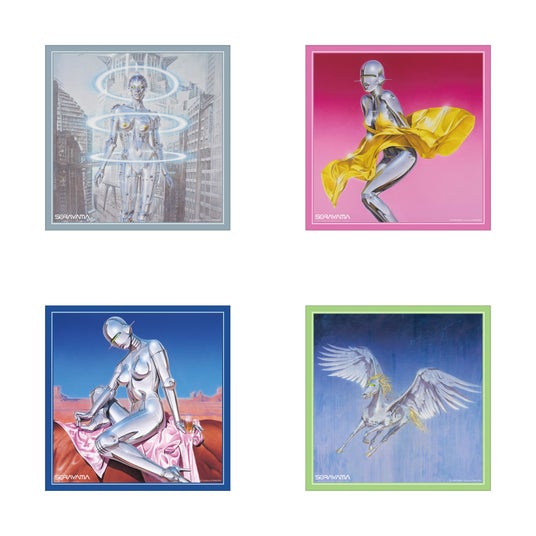 スカーフ空山基作品から厳選された4点をスカーフ化。サイズは普段使いのしやすい約56cmでサテン生地。