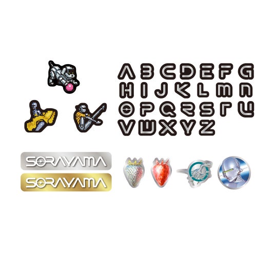 空山基によるSORAYAMAフォントのアルファベットやロゴをはじめ、作品群やピクセルシリーズのワッペンが登場。お好きな展覧会グッズやご自身のアイテムにも付けることの出来るアイロン圧着タイプ。ワッペンの裏面はシール仕様のため、アイロンを使わずに貼ることもできるカスタムアイテム。