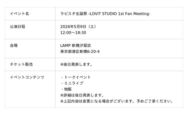 「ラビスタ生誕祭 -LOViT STUDIO 1st Fan Meeting-」ではトークイベントやミニライブなど、様々な企画を実施予定です。現在、ラビスタではそれら企画への参加権を争う事務所イベントを実施中です。詳細は下記noteをご覧ください。https://note.com/lovit_studio/n/ne89737420bd0