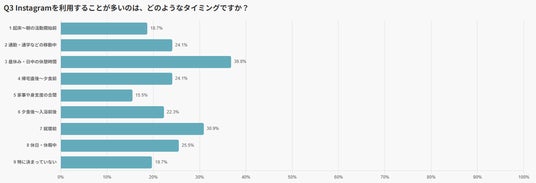 Instagramを利用している日本人427人の回答を見ると、特定の時間帯に偏るのではなく、生活の節目ごとにアプリを開く習慣が見て取れました。