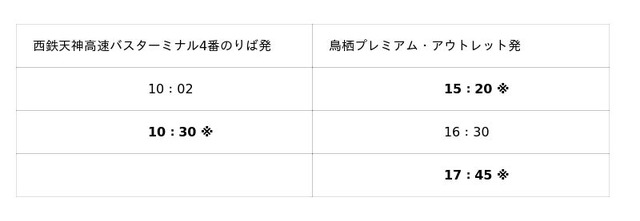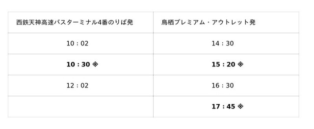 「PREMIUM OUTLETS(R) SALE」期間中の、週末は福岡天神からの直行バスを増便、より便利に、ゆっくりとお買い物をお楽しみいただけます。<3月13日(金)運行スケジュール> ※は特別運行便