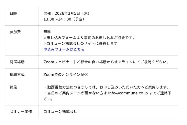 総合マーケティングリサーチ会社の日本インフォメーション株式会社(本社:東京都中央区、代表取締役社長:斎藤啓太)は、2026年3月5日(木)13:00よりコミューン株式会社とともに、無料オンラインセミナーを開催します。