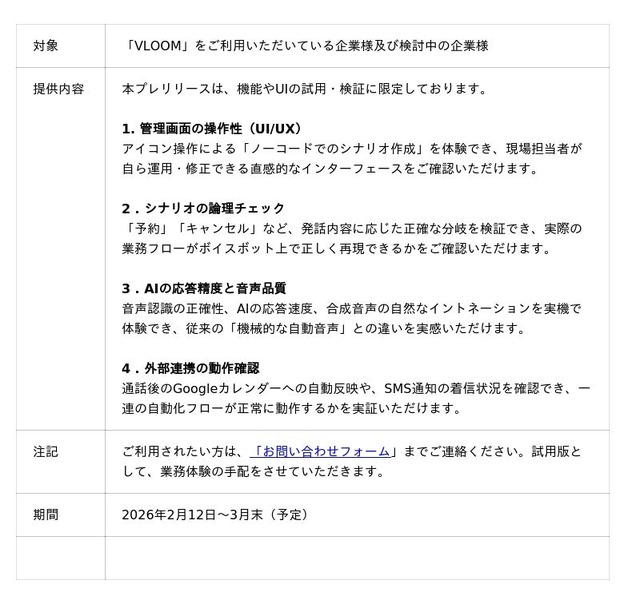 本件は、2026年春予定の正式リリースに先駆け、実際の操作画面(UI)やシナリオ作成の柔軟性を「VLOOM」をご利用いただいている企業様及び検討中の企業様に先行体験いただくことを目的としています。