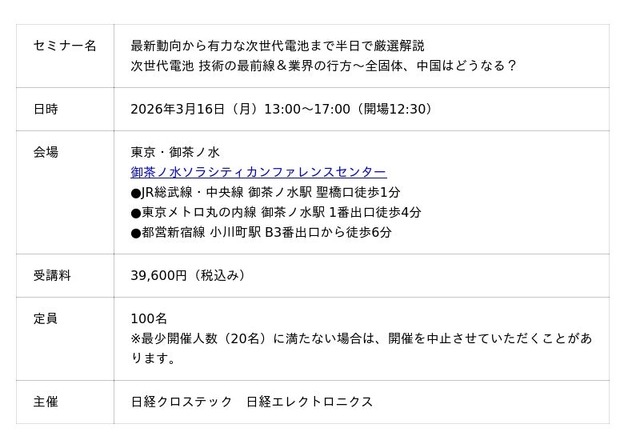 2026年3月16日(月)13:00~17:00、東京・お茶の水で「次世代電池」 技術の最前線&業界の行方を徹底解説するセミナーを開催します。