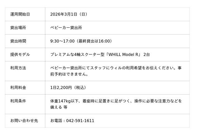 WHILL株式会社(本社:東京都品川区、代表取締役社長 CEO:杉江理、以下「WHILL社」)は、免許不要で歩行領域を走行する近距離モビリティWHILL(ウィル)を活用した移動サービス「WHILLモビリティサービス」が、多摩動物公園(所在:東京都日野市)で2026年3月1日(日)より導入されることを発表いたします。高齢化や多様化が加速する中、ご高齢の方や長距離の歩行が難しい方にも、自然あふれる広い敷地内を快適に周遊できるアクセシビリティ体制を整えるものです。