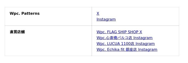 展開ブランド :Wpc. / W by Wpc. / Wpc. IZA / SiNCA by Wpc. / ONDOO by Wpc. / Wpc. Patterns / UVO / go-koh / KiU / VEER / L.o.F. design / GUERRILLA by KiU