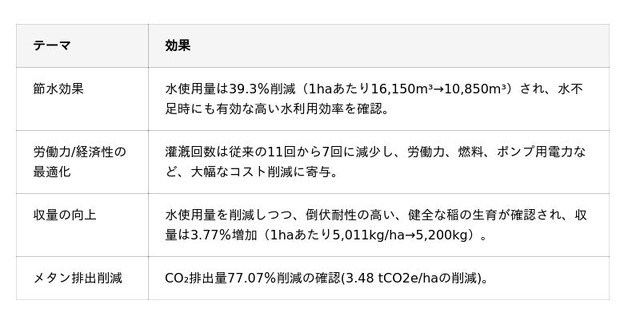 本プロジェクトでは、間断灌漑(Alternate Wetting and Drying:AWD)を水田圃場に導入し、「持続可能な農法は収量を犠牲にする」という従来の認識を覆しました。従来の連続湛水(CF)と比較した結果、下記、プラスの影響が確認されました。