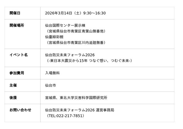 JAF(一般社団法人日本自動車連盟)宮城支部(支部長 梅津 行雄)は、3月14日(土)に仙台国際センター展示棟(宮城県仙台市青葉区青葉山無番地)および仙臺緑彩館(宮城県仙台市青葉区川内追廻無番)で開催される「仙台防災未来フォーラム2026」にJAFブースを出展します。