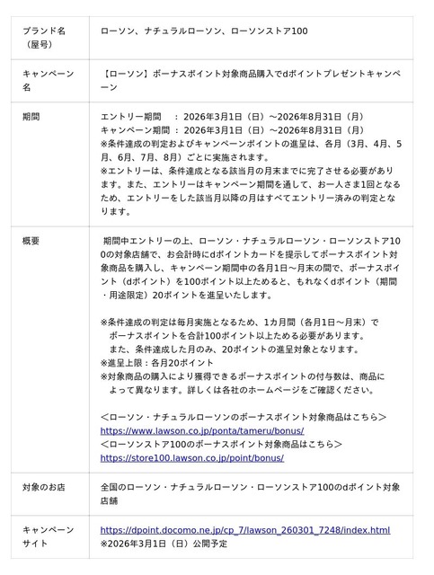 本キャンペーンにはエントリーが必要です。キャンペーンサイトよりエントリーの上、ローソン・ナチュラルローソン・ローソンストア100の対象店舗で、お会計時にdポイントカード※1を提示してボーナスポイント対象商品を購入いただき、キャンペーン期間中の各月1日~月末の間で、ボーナスポイント(dポイント)を合計100ポイント以上ためると、もれなくdポイント(期間・用途限定)20ポイントを進呈いたします※2。