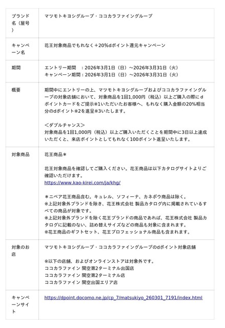 本キャンペーンの参加にはエントリーが必要で、マツモトキヨシグループおよびココカラファイングループの対象店舗において、対象の花王商品(以下、対象商品)を1回1,000円(税込)以上ご購入の際にdポイントカードをご提示※1いただいたお客様へ、もれなく購入金額の20%相当分のdポイント※2を進呈※3いたします。さらに、対象商品を1回1,000円(税込)以上ご購入いただくことを期間中に3日以上達成いただくと、来店ポイントとしてもれなく100ポイント進呈いたします。キャンペーン詳細は、キャンペーンサイトにてご確認ください。