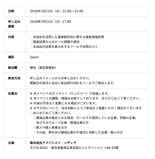 本ウェビナーでは、当社が実施した最新のアンケート結果をもとに、議事録作成における生成AI活用の実態を共有。ディスカッション形式で議事録作成の現在地とこれからの姿を多角的に探ります。さらに、実務で役立つ議事録作成で生成AIを効果的に活用するポイントもわかりやすくお伝えします。