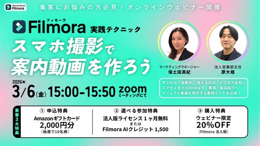 株式会社ワンダーシェアーソフトウェア(東京都港区、代表:呉太兵)は、動画編集ソフト『Filmora(フィモーラ)』を活用し、未経験からでも即実践できる動画制作ノウハウをお伝えする無料オンラインセミナーを、2026年3月6日(金)15:00より開催いたします 。