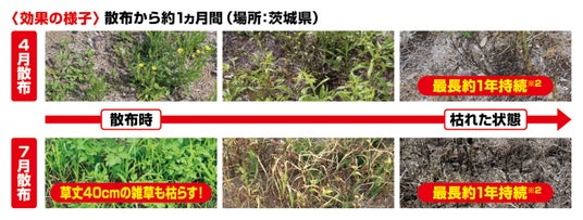 ※1草丈50cm以下の一年生雑草での事例 ※2最大散布量を散布した場合の刈り取り不要期間の目安で、雑草がまったく発生しないということではありません。持続期間は土壌条件、気象条件によって変動します。