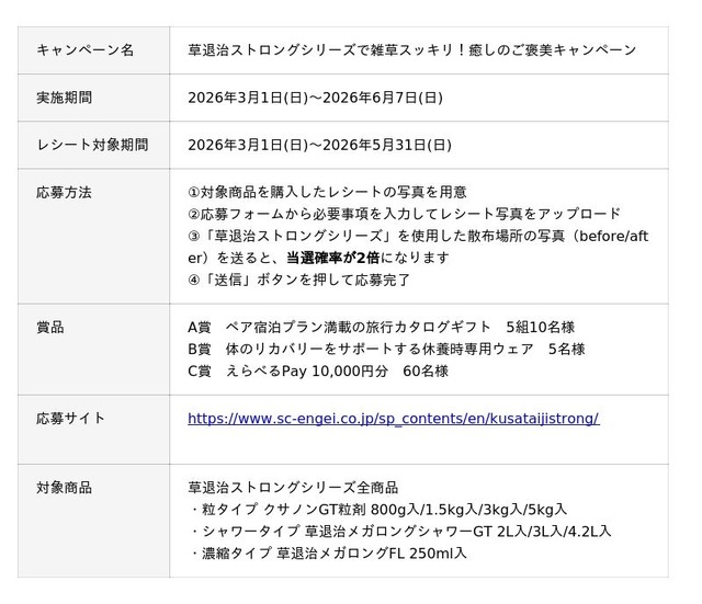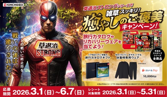 家庭園芸用薬品・肥料等を製造販売するKINCHO園芸株式会社(本社:東京都中央区/代表取締役社長:森本 義之)は、除草剤「草退治ストロングシリーズ」の新発売を記念し、「草退治ストロングシリーズで雑草スッキリ!癒しのご褒美キャンペーン!」を実施いたします。