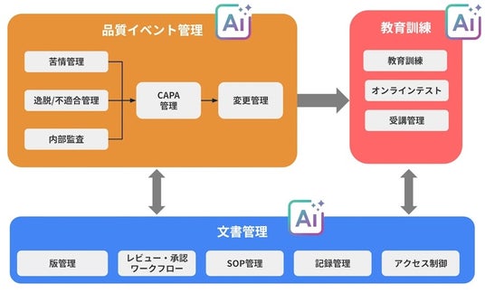 - AIによる支援機能・文書のAI規制チェック:QMS省令、ISO13485などの規制適合性を自動でチェック・根本原因の自動分析:苦情等の品質情報や過去の類似事例データをもとに根本原因を深堀り・オンラインテストの自動生成:文書からオンラインテスト問題を自動生成。教育資料の作成時間を大幅に短縮