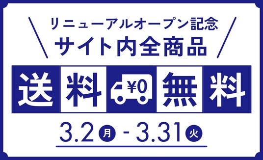 リニューアルを記念し2026年3月2日~31日の間、サイト内全品送料無料となるキャンペーンを実施いたします。