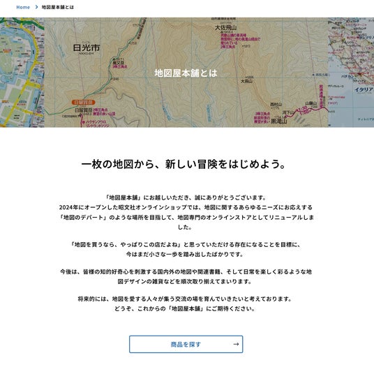 このリニューアルの目指すものとして、当社グループは地図を単なる「道案内の道具」ではなく、人々の生活を楽しく彩り、知的好奇心を刺激する「知のインフラ」だと考えています。今後目利き衆に地図に見識のある様々な方をお迎えするなど、将来的には地図を愛する人々が集う交流の場を育んでいきたいと考えております。)) 「地図屋本舗」サイト概要 ((