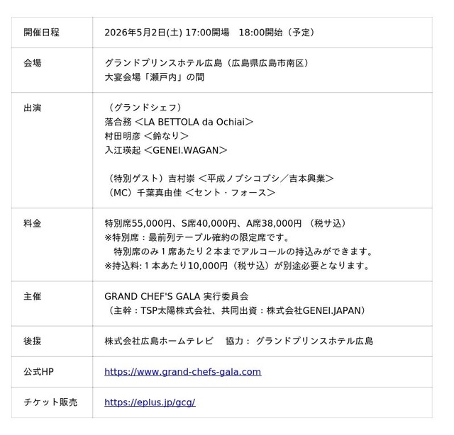 GRAND CHEF'S GALA 実行委員会(TSP太陽株式会社:以下当社、株式会社GENEI.JAPAN)は、東京のスターシェフと開催地域特有の食材を掛け合わせたプレミアムディナーイベント「GRAND CHEF'S GALA in Hiroshima 2026 Spring」(グランド シェフズ ガラ、以下本イベント)を、2026年5月2日(土)にグランドプリンスホテル広島にて開催いたします。