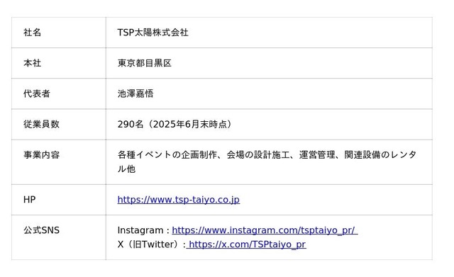 2025年で設立70周年を迎えたTSP太陽株式会社は、空間ソリューションによるイベントコンサルティングから企画・制作まで、あらゆる感動の場を一気通貫した支援で創造するプロフェッショナル集団です。国際的なビッグイベントを始め、あらゆるイベントに携わるデザイン・コンサルティング会社として、収益の最大化を図る事前収支計画から企画・クリエイティブ制作・建築設計・施工・運営までをトータルソリューションとして提供しています。PR・プロモーション・イベントに付随するホスピタリティサービスもお任せください。近年では、豊富な経験から培われた独自のノウハウを駆使し、ダイバーシティやSDGs・ESGへの取り組みを積極的に推進しています。