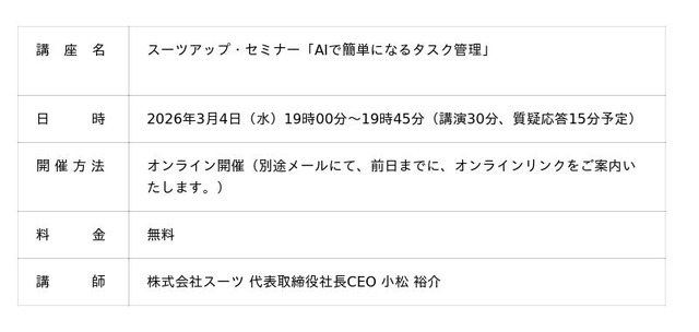 当社では、2026年3月4日(水)19時から、当社代表の小松が講師を務めるスーツアップ・セミナー「AIで簡単になるタスク管理」を無料開催します。