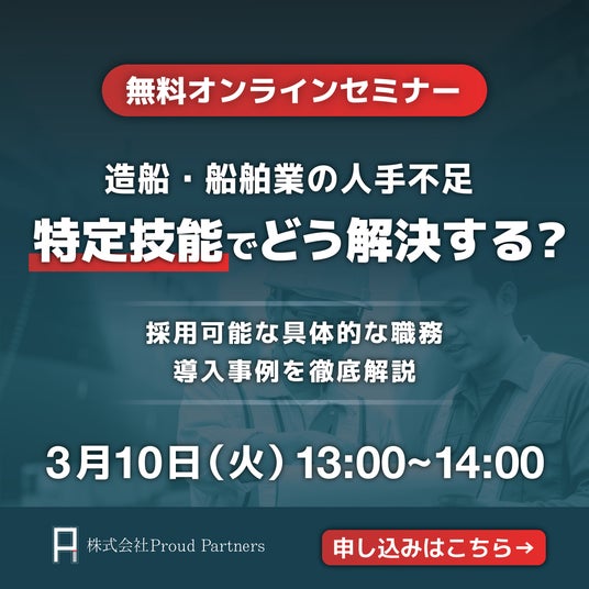 株式会社Proud Partners(本社:東京都新宿区、代表取締役:鈴木竜二)は、造船・舶用工業分野を対象に、特定技能人財の受入れ・定着による「慢性的な人手不足」の解消をテーマに、無料オンラインセミナー「造船・舶用工業分野における特定技能人財セミナー」を2026年3月10日(火)の13:00-14:00に開催します。【特設サイト】https://bp.proudcorp.com/mar-ship-og