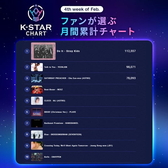 『K-STAR CHART presents POP-K TOP10 Friday』週間チャートの投票数の累計で決まる月間チャート1位は、Stray Kidsによる「Do It」となり、番組内でもオンエアされました。