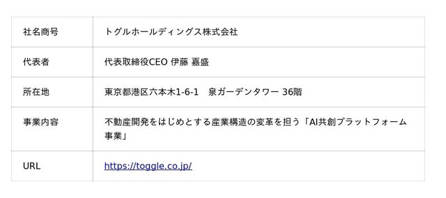 トグルホールディングス株式会社は、「不動産業界における属人知の超克を礎として、産業社会に革命をもたらす。」をミッションに掲げ、AIとリアルビジネスの融合による産業構造の変革に取り組んでいます。