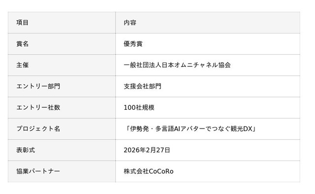 JetB株式会社(本社:東京都新宿区、代表取締役:竹内 勇人、以下「JetB」)は、株式会社CoCoRo(本社:東京都文京区、代表取締役: 清原 正光、以下「CoCoRo」)との協業プロジェクト「伊勢発・多言語AIアバターでつなぐ観光DX」にて、一般社団法人日本オムニチャネル協会が主催する「DXイノベーション大賞」の支援会社部門「優秀賞」を受賞したことをお知らせいたします。