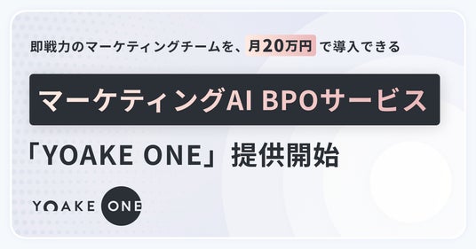 株式会社YOAKE(本社:東京都世田谷区、代表取締役CEO:山田 翔大、以下「YOAKE」)は、マーケティングAI BPOサービス『YOAKE ONE(読み:ヨアケ ワン)』の提供を開始いたしました。