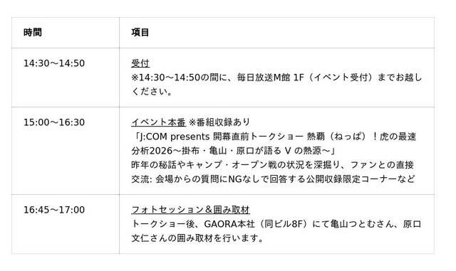JCOM株式会社(本社:東京都千代田区、代表取締役社長:岩木 陽一、以下「J:COM」)は、スポーツチャンネル「GAORA SPORTS」を運営する株式会社GAORA(本社:大阪市北区)の協力のもと、2026年プロ野球開幕を目前に控えた3月8日(日)に「ちゃやまちプラザ」にて特別トークショーを開催いたします。 出演者は、ミスタータイガース・掛布雅之さん、プロ野球解説者の亀山つとむさん、昨季までチームを支え、今季からOBとしてタイガースを見守る原口文仁さんに加え、ゲストとして俳優でタイガースファンの中江有里さんをお迎えします。4名の皆さまに、球団史上初の連覇を目指し突き進むタイガースの展望について熱く語り合っていただきます。