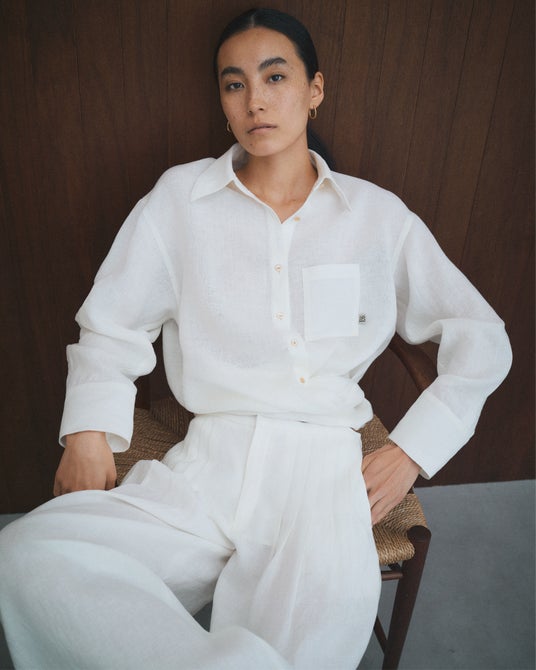 Linen message wrap Shirt ¥42,900 Linen relaxed dress Pants ¥53,900