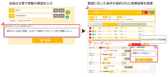 本機能では、ユーザーが自由な文章で入力した「移動に関する要望」から、AIが最適な検索条件(発着日時や表示順、使用する交通手段など)を推定し、自動で経路検索結果に反映させます。例えば「今日の15時に出発。バスを使わないで、乗り換え回数を少なくしたい」のように、複数の条件が含まれていても、1つずつ自分で設定する手間が必要ありません。また、「荷物を持って移動する」や「節約したい」など、詳細設定にはない間接的な要望もくみ取った上で最適な経路が出るように、「乗換時間をゆっくりに設定」「表示を料金順」といった検索条件へ変換して設定がされます。さらに、1度出した検索結果を再検索する際にも利用でき、まるで詳しい人に相談するような感覚で経路をカスタマイズしていくことが可能です。交通に詳しくない方や、設定自体が面倒といった方にも、手軽に快適な経路を選択していただけます。