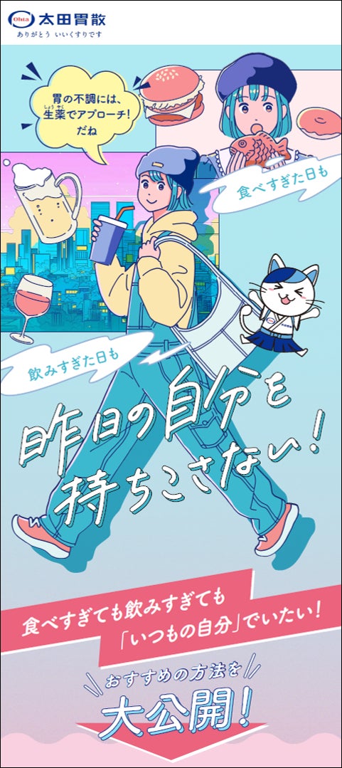 食べすぎや飲みすぎた翌日も「いつもの自分で楽しく」過ごせるように。太田胃散では、胃もたれや胸やけといった「お疲れの胃」の症状には、「生薬を配合した薬」が不調を整えるサポートができる ということを、広く知ってもらいたいという想いから、「胃にお疲れさん太田胃散♪」をテーマに、主に20代や30代のみなさまに向けてスペシャルムービー&スペシャルサイトを制作しました。