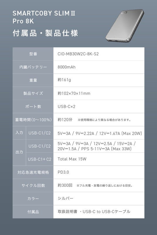 株式会社CIO(本社:大阪府守口市、代表取締役社長:中橋 翔大)は、有線30W出力、8000mAhモバイルバッテリー『SMARTCOBY SLIMIIPro8K』を7,130円(税込)にて、2026年3月3日(金)よりAmazon.co.jpにて販売開始。順次、楽天市場のCIO公式オンラインストア、ならびに一部の家電量販店、直営店CIO STOREなどにて販売を開始いたします。
