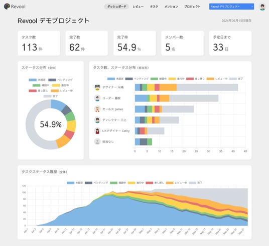 Revoolのダッシュボードでは、プロジェクト全体のタスク数やタスク完了率に加え、担当者別のタスク数からステータス分布が一目でわかります。