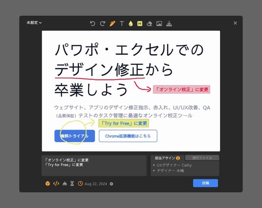パワーポイントやエクセルに画面キャプチャを貼り、コメントを書き込む従来のプロセスと比べて、制作物の修正指示の作成からタスクの共有まで、チームでの制作が格段にしやすくなります。