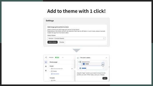 テーマエディタからアプリブロック(またはアプリセクション)として追加するだけで、コード編集なしで画像ギャラリーを表示できます。