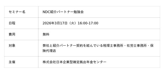 現在、企業の福利厚生および退職金制度として「企業型DC」への注目が急速に高まっています。一方で、顧問先を抱える士業や代理店の皆様からは、「提案のタイミングが難しい」「法改正の内容を正しく把握しきれていない」「より効率的に紹介報酬につなげたい」といった声も多く寄せられています。本勉強会では、累計400社以上の導入支援実績を持ち、YouTube『DCチャンネル』でも知られる弊社執行役員の石黒充顕が登壇。最新の法改正を踏まえた基礎知識から、顧問先に喜ばれながら効率的に報酬を獲得するための「実践的な提案手法」を具体的に伝授します。