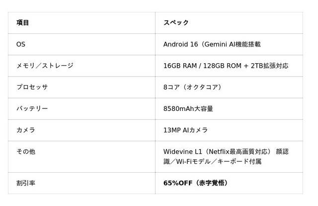 上記4モデル以外にも、13インチ大画面タブレット(120Hz・12000mAh・6点アクセサリー付き)を含むタブレットシリーズ、骨伝導耳機、AIスマートウォッチなど、多品類合計30モデル以上がすべて20%以上OFFで登場。楽天市場 Android16タブレット、楽天市場 子供タブレット、SIMフリースマホ Android16をお探しの方に最適なラインナップです。